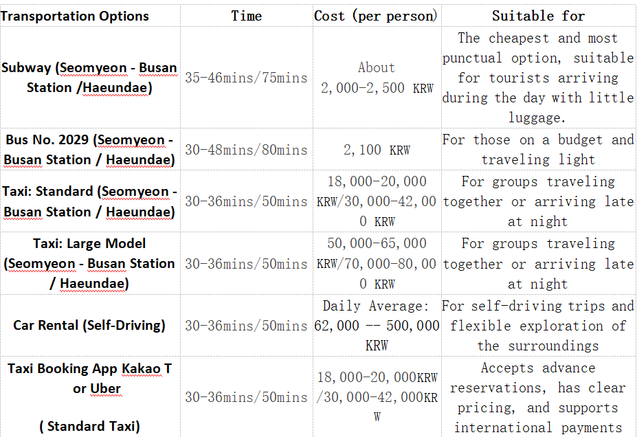 - Busan Station: First, reach Seomyeon Station, then transfer to Bus No. 81 to Busan Station, approximately 48 minutes.