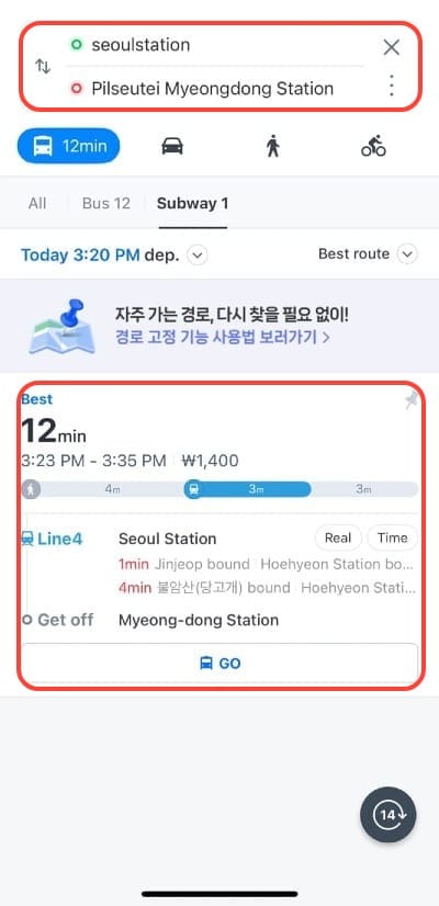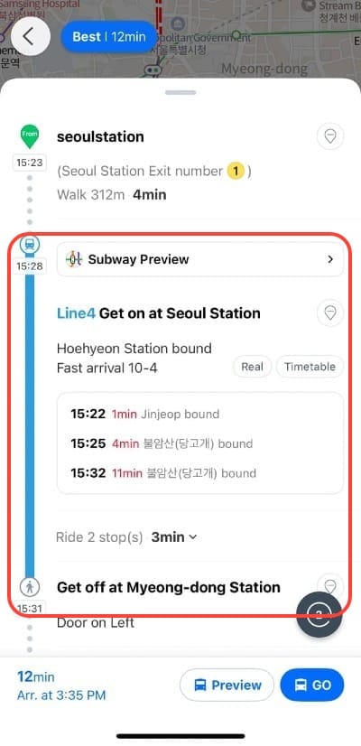 Open Naver Map, enter your departure and destination, and you can view subway route information (see the red box below).