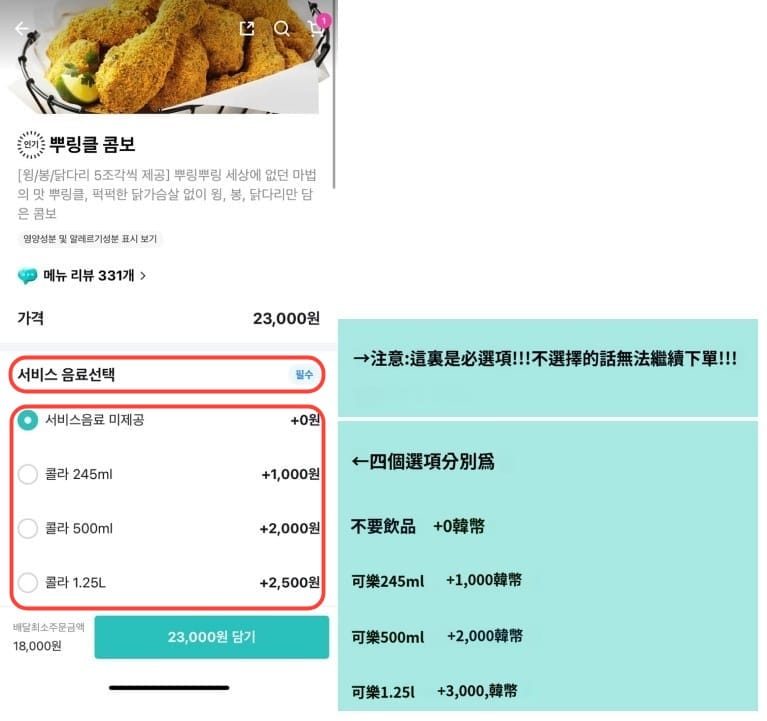 例如,下圖顯示了飲品選項,這是點炸雞時必須選擇的。