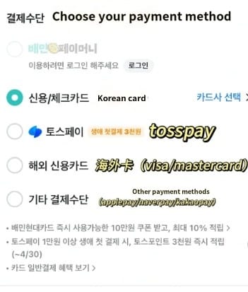 Payment Methods: Korean credit cards, bank cards, Kakao Pay, and support for overseas bank card payments.