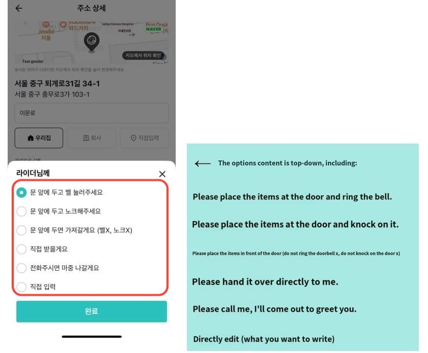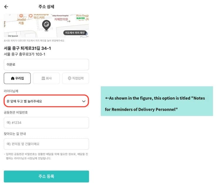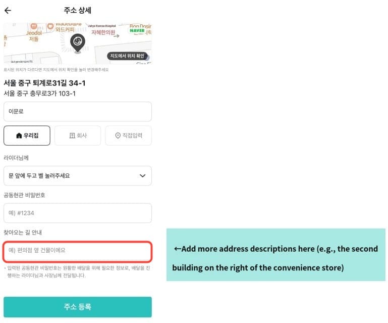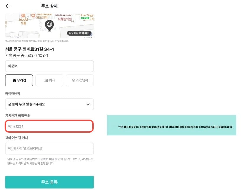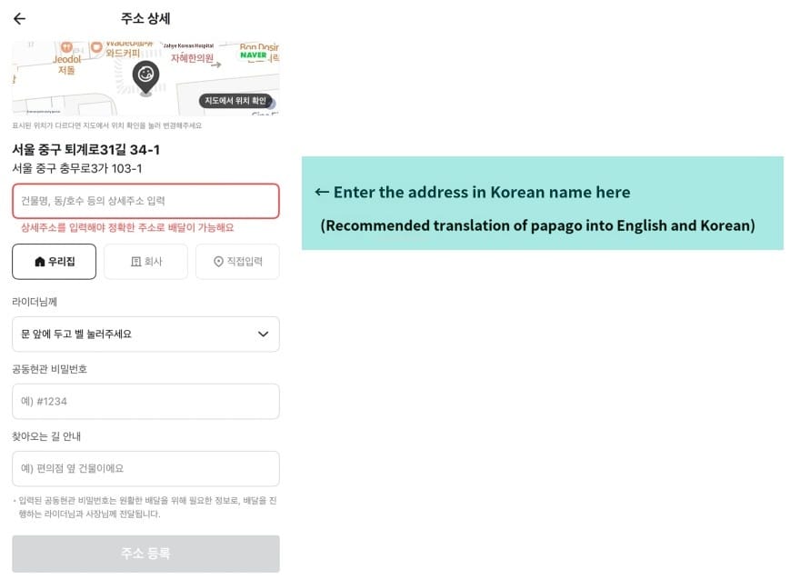 Note: In the red box in the image, enter the address in Korean (it is recommended to use Papago for translation, translating the English address into Korean).