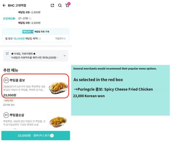 STEP 2. Then, enter the store page (taking BHC Fried Chicken as an example). The items displayed from top to bottom in the red box are: