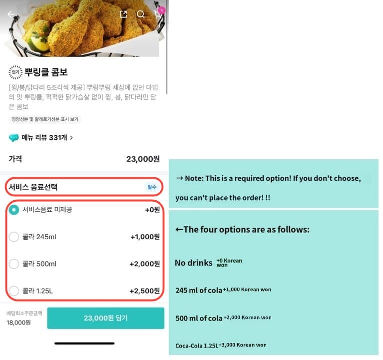 for example, following image shows Drink Options and it is required to order the chicken.