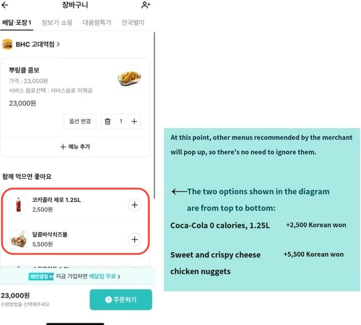 뿌링클 (Ppuringcle)콤보, Cheese Spicy Fried Chicken, 23,000 KRW.