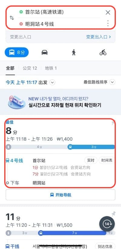 打開Naver Map,輸入出發地與目的地,即可瀏覽地鐵路線資訊(下圖紅框處)。